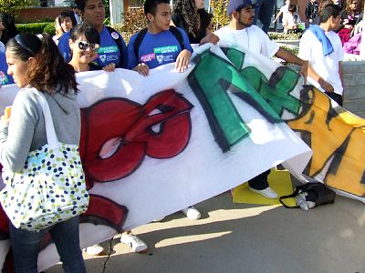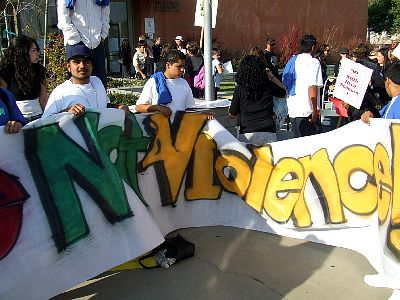 Students with a giant banner painted by one of their classmates: "Teach Peace Not Violence!" |