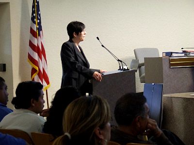 MBHS Principal Cheryl Seelos slips back into the board meeting after the break and is given extended time to speak even though the agenda item was supposedly over. She accuses the student and teacher from her school who testifed earlier of misrepresenting the facts. Later, she appears in a TV news report telling the public "They're not guns, they're air rifles." |