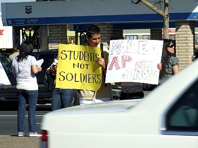 Right sign: "More AP, not JROTC!" (AP=advanced placement) |
