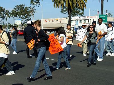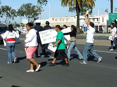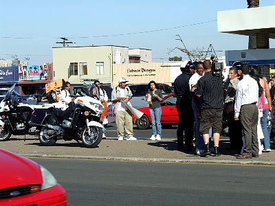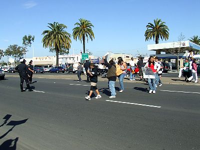 Police force students back to the side of the street. |