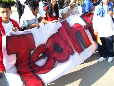 Students with a giant banner painted by one of their classmates: "Teach Peace Not Violence!" |